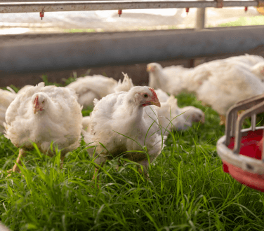 Our birds live the first 3 weeks of their lives in the brooder so they can develop their feathers to better regulate their own body temperature. As soon as they are ready, they move out to the pasture for the remainder of their lives where they can run around in the grass and forage freely.
